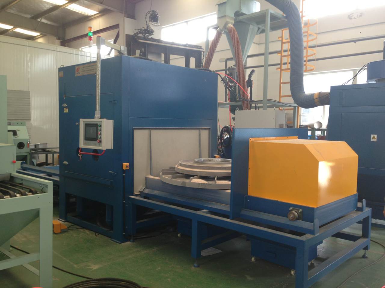 2.3.2主要設備結(jié)構(gòu) 主要由主機噴砂室、轉(zhuǎn)盤轉(zhuǎn)動機構(gòu)、噴槍擺動機構(gòu)、臺車、電控系統(tǒng)等組;